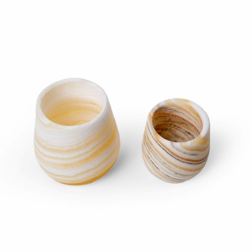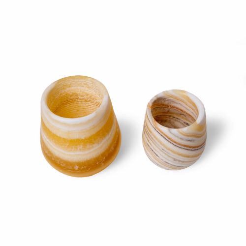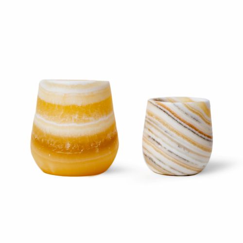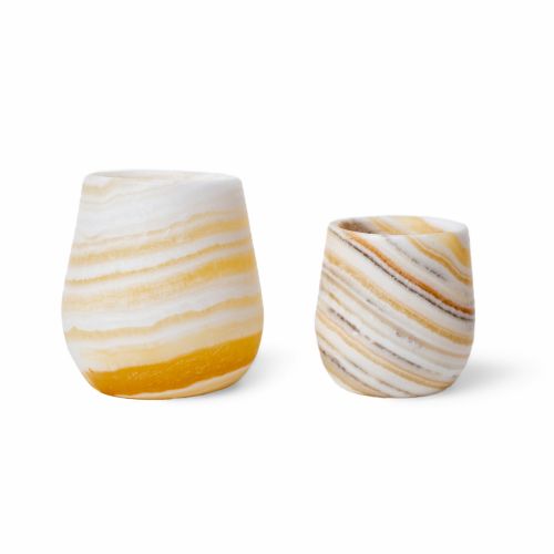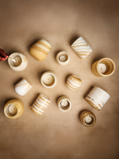 Egyptian alabaster is beauty sculpted by nature. Each piece is carved from stone, revealing its own unique constellation of veins, swirls, and mineral markings-no two pieces will ever be the same. When lit from within, the alabaster comes alive: its natural veins glow in warm, luminous patterns, turning the stone into a soft, radiant lantern. The deeper the light, the more the hidden character of the alabaster reveals itself, creating a timeless, earthy elegance. that feels both ancient and etheral.