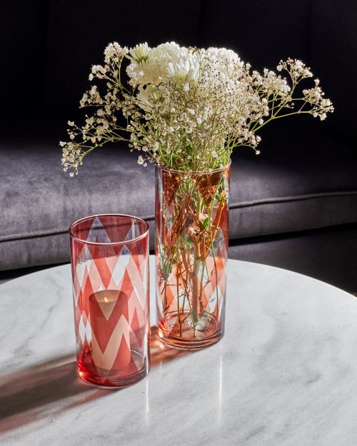 Transform your space with the Chevron patterned vase, a stunning piece made from mouth-blown glass and hand-finished with a beautiful chevron pattern.