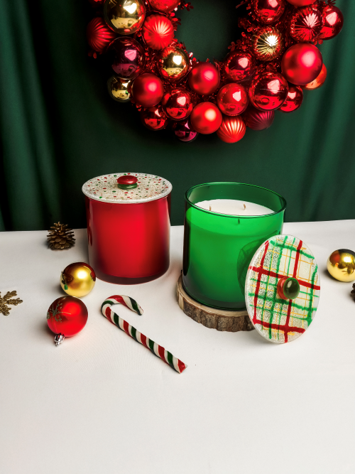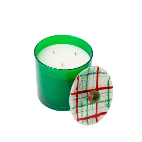 Housed in a luminous green glass jar, this candle brings the comforting warmth of the winter holidays into your home. Each glass jar is mouth blown and hand painted and the coordinating, hand crafted fused glass lid is also hand painted in a charming Christmas plaid pattern, giving it a playful yet sophisticated seasonal character.