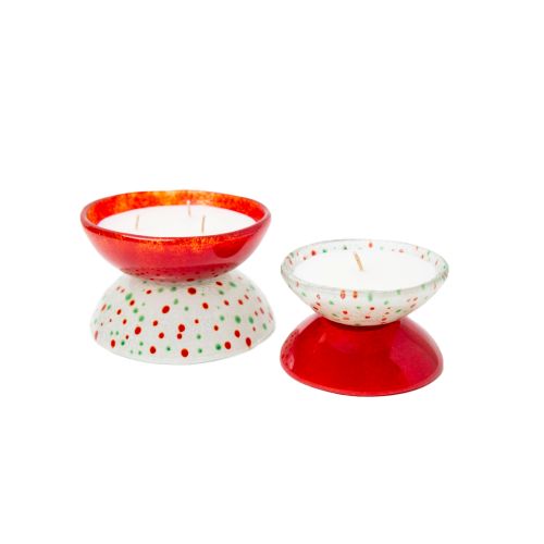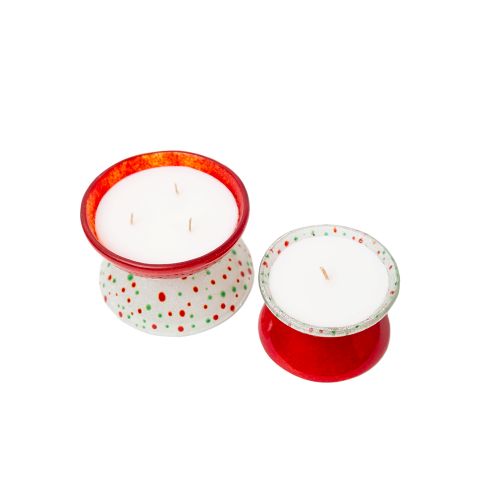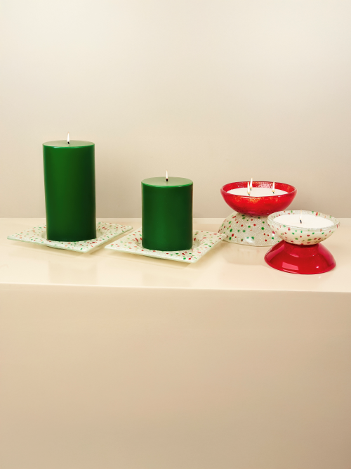 We proudly present our first time collaboration with Walid Onsy. Recognised for creating artistic and functional fused glass art, we collaborated to bring you an exclusive, one of a kind collection to cherish for the holidays. Sprinkled with red and green confetti flecks, these whimsical bowls are not only filled with our popular caramalized vanilla scent, but they are also reuseable. Once you have enjoyed the scent of the candle, you can repurpose the bowls as they can be filled with cholcolate treats, dips, guest soap, jewelry…whatever you like! And the bowls are reversable! Each piece is unique in its own right, making them extra special as no two pieces are alike. Small: 9cm D x 8cm H Large: 12cm D x 10cm H