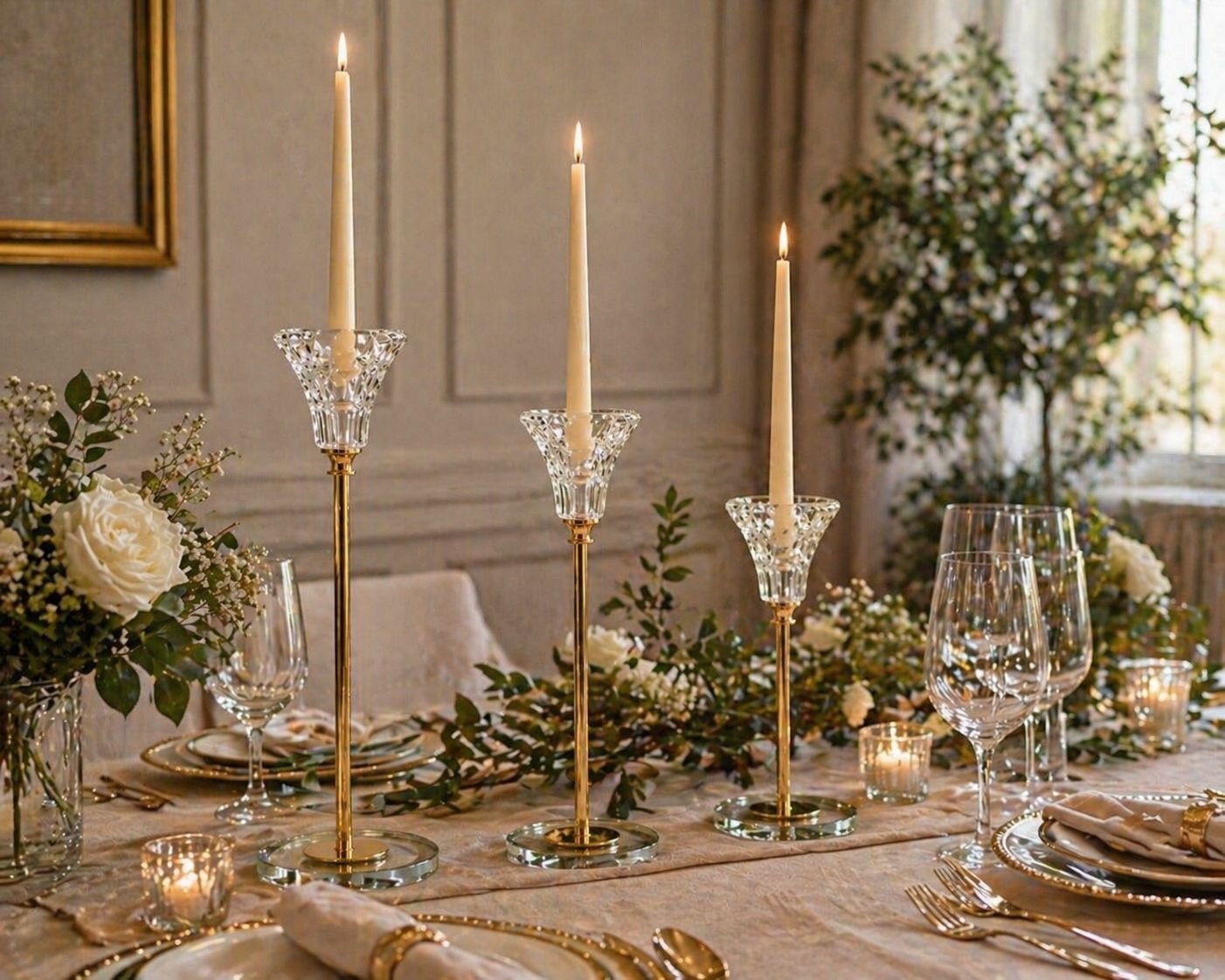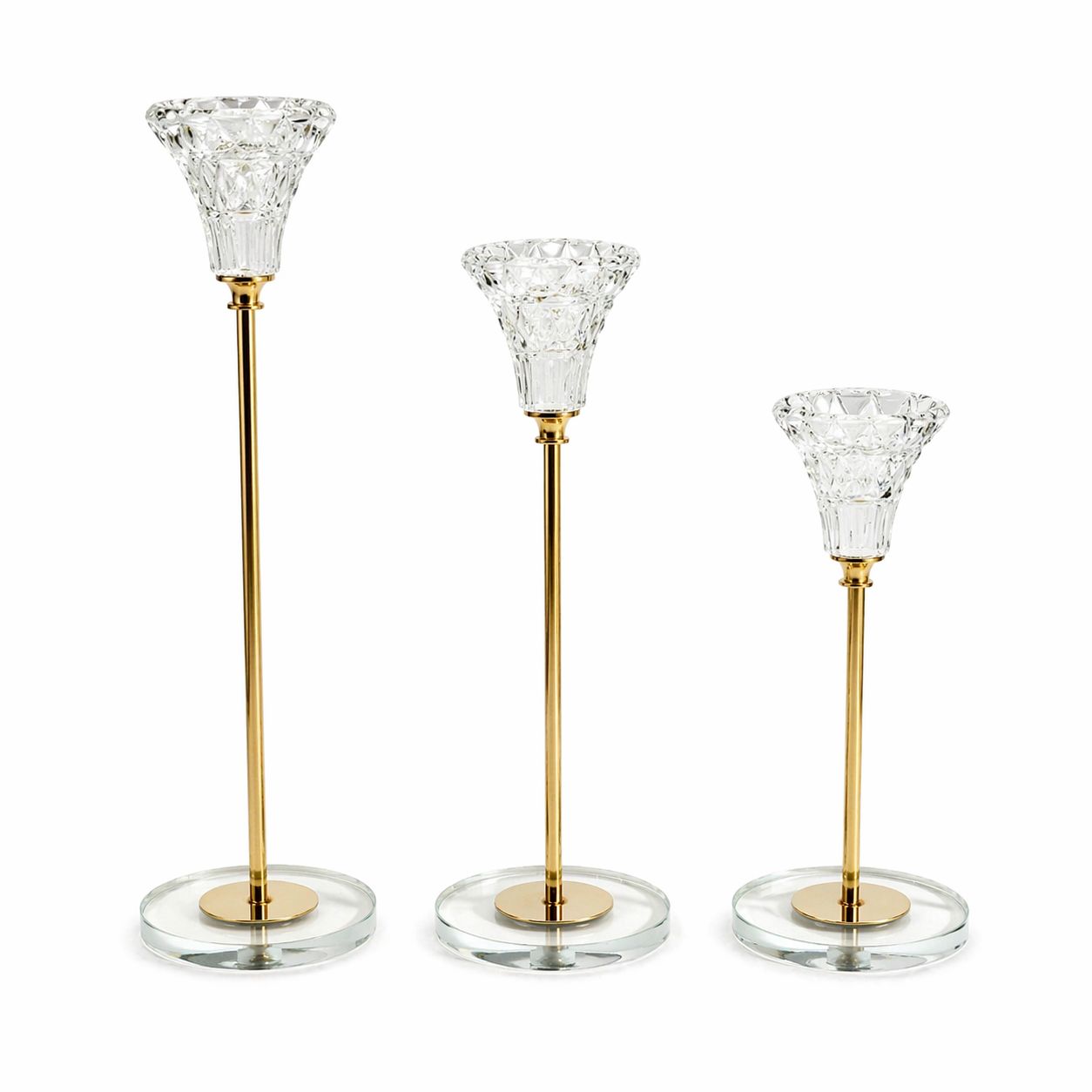 An elegant set of three candle holders featuring a refined blend of crystal-cut glass and polished gold stems. Designed in varying heights, each piece creates a balanced, sophisticated visual display that enhances any interior space. Candles sold separately.